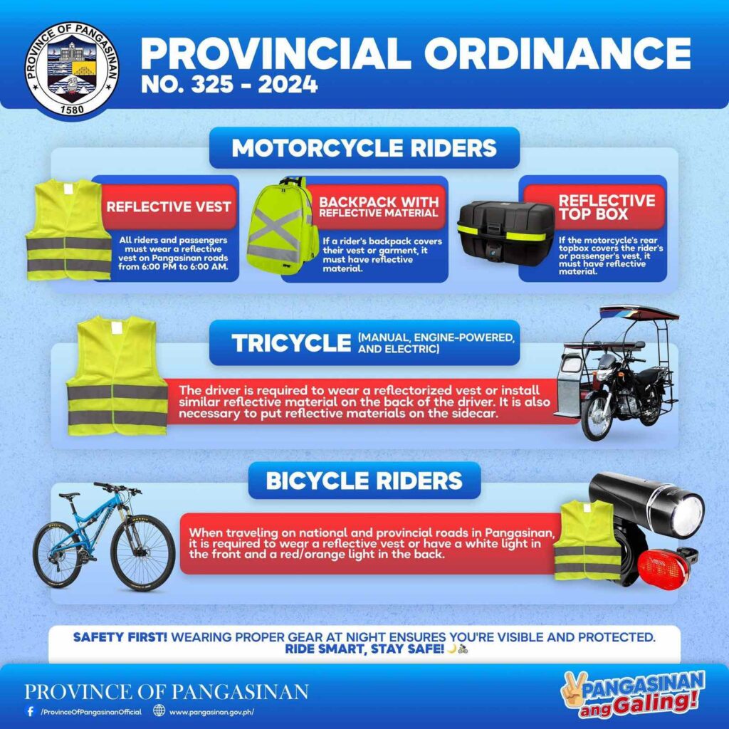 Newly released Provincial Ordinance No 325-2024 states that motorcycle riders, tricycle and bicycle riders are all REQUIRED to wear reflectorized safety vests from 6 pm to 6 am, starting August 15, 2024.